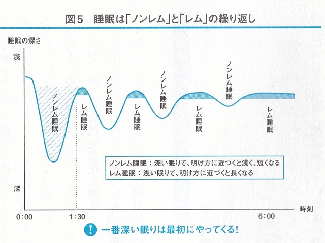 これを見てもらうと、人の睡眠は眠り始めのノンレム睡眠が最も深く、朝に近づくにつれ、浅いレム睡眠の時間が増えている事がわかります。