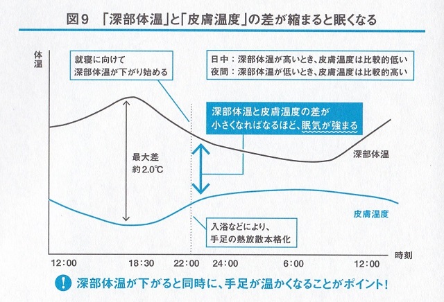 大人では子供程の変化は起こりませんが同様の現象が起きていて、「皮膚温度と深部温度の差が縮まった時に入眠しやすい」という研究データは学術誌『Nature』でも発表されています。