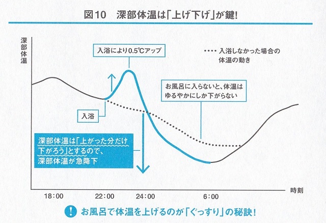 つまり、入浴によって意図的に深部体温を上昇させれば、入眠時に必要な「深部体温の下降」がより大きくなり熟睡につながるのです。